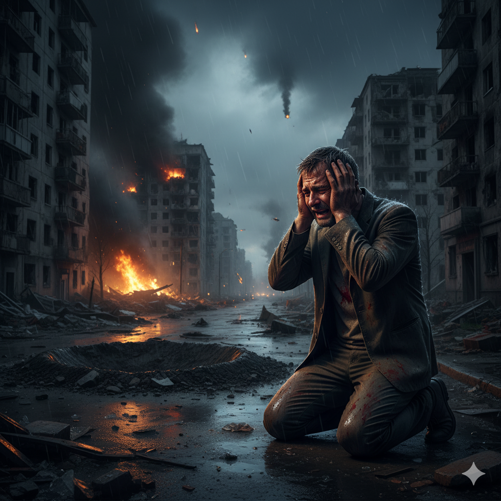 El padre chilla pidiendo ayuda, pero el estruendo de las bombas apaga su voz.